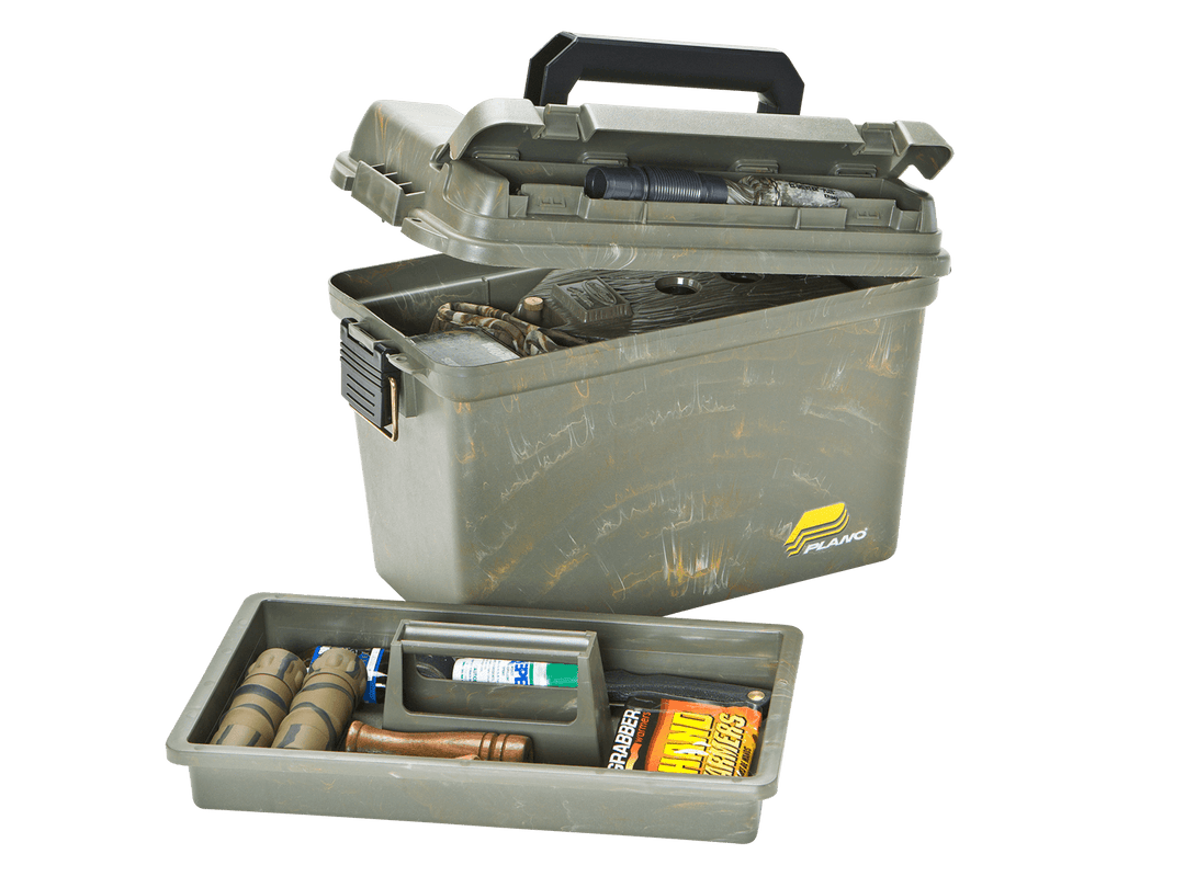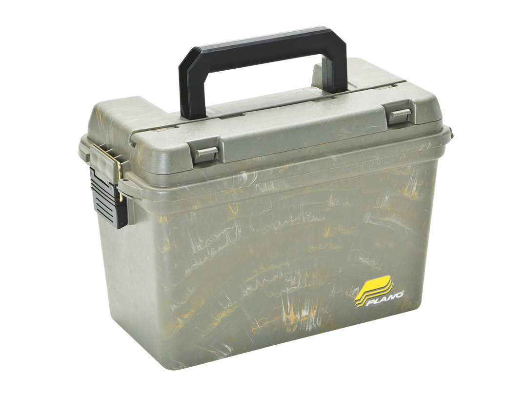 The Element-Proof Field/Ammo Box Large with Tray has just what you need to keep all the essentials organized. This .50 cal ammo box holds up to six boxes of shot shells, with a top-access lid compartment and lift-out tray for additional storage. It features the dependable Plano brass-bailed latch for a secure closure, plus a water-resistant O-ring seal. Carries easily to the range or job site with an extra heavy-duty handle.