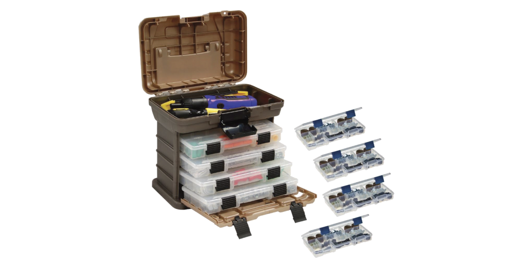 Plano’s Small Rack Organizer includes four dependable StowAway® utility boxes that slide into place just like drawers, but can be removed just as easily for individual use. Each utility box comes with adjustable dividers so you can customize the number and size of interior compartments. Up top, the lid holds a spacious storage area for bulkier items that may not fit in one of the smaller boxes. Ideal storage solution for a desk, closet, pantry or kids room.