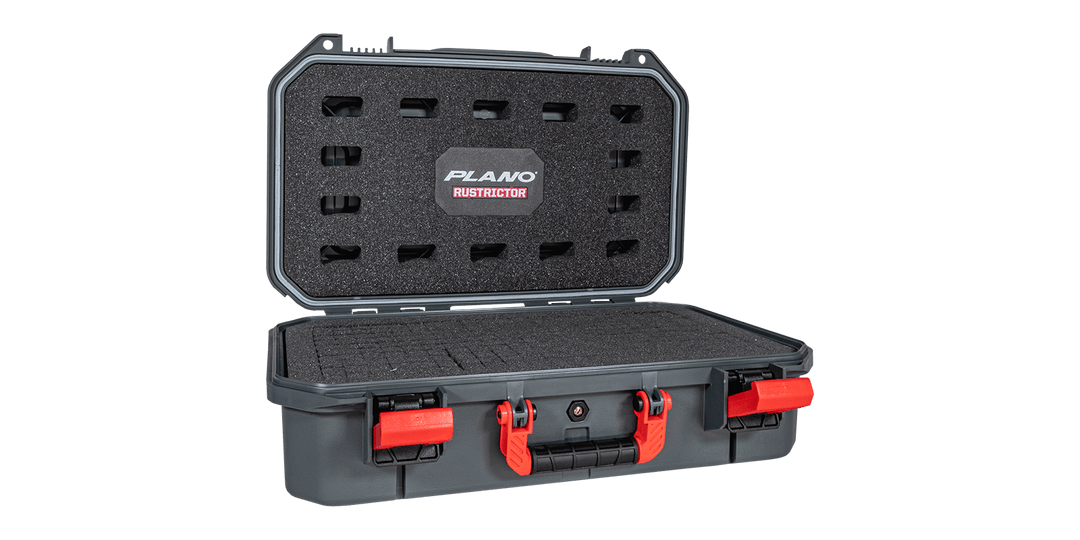 Plano’s most popular pistol cases are now backed by the power of Rustrictor. This revolutionary technology surrounds case contents with rust-blocking protection. Each handgun case also includes a Dri-Loc® seal to keep water and dust out. This means no matter what tries to mess with your handgun, the Rustrictor AW2 Four-Pistol case is equipped to fight back and keep your firearm secure. The largest pistol case in the All Weather line, this gun case holds up to four pistols – plus extra mags and accessories – in double layers of pre-perforated pluck foam. A dependable and durable home for your most prized handguns.