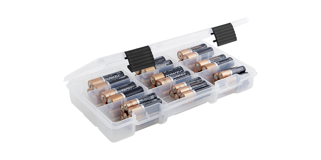 De-clutter your junk drawer with the Small Battery Organizer from Plano. This non-corrosive, translucent box is sized to hold AAA or AA sized batteries and can be stored safely in the refrigerator or elsewhere in your home.